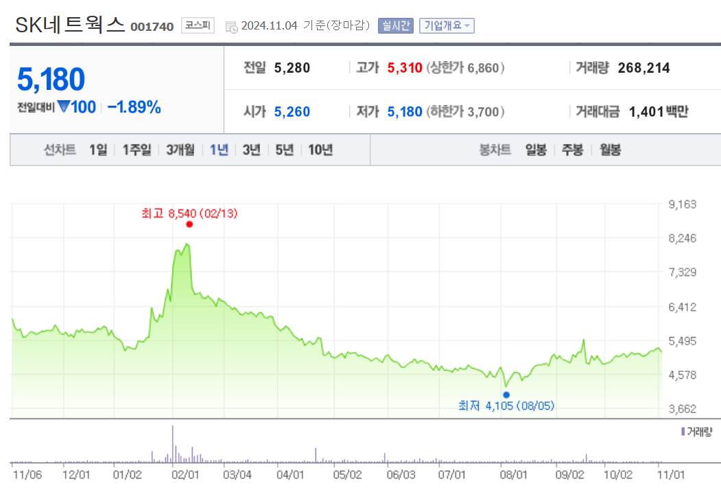 단기 포트폴리오를 구성할 때 시가 총액과 장중 거래량도 주의깊게 봐야 합니다. SK네트웍스의 시가 총액은 1조1462억 원이며 장중 거래량은 358,582원 을 기록했습니다. 대주주의 정보는 중요하지 않을 수도 있지만 장기적인 관점에서는 확인하는 것이 좋습니다.