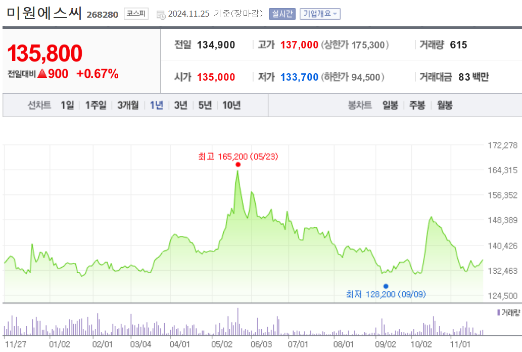미원에스씨의 현재 주가는 134,900원입니다. 전일 대비 -8.79원 이동한 모습입니다. 시가 총액은 6790억 원이며 발행 주식은 총 5,000,000주 입니다. 외국인이 보유한 비중은 0.46%입니다.