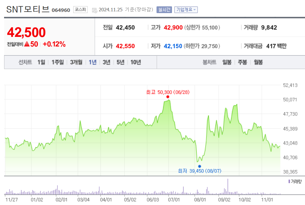 SNT모티브의 현재 주가는 42,450원입니다. 전일 대비 -6.60원 이동한 모습입니다. 시가 총액은 6215억 원이며 발행 주식은 총 14,623,136주 입니다. 외국인이 보유한 비중은 14.63%입니다.